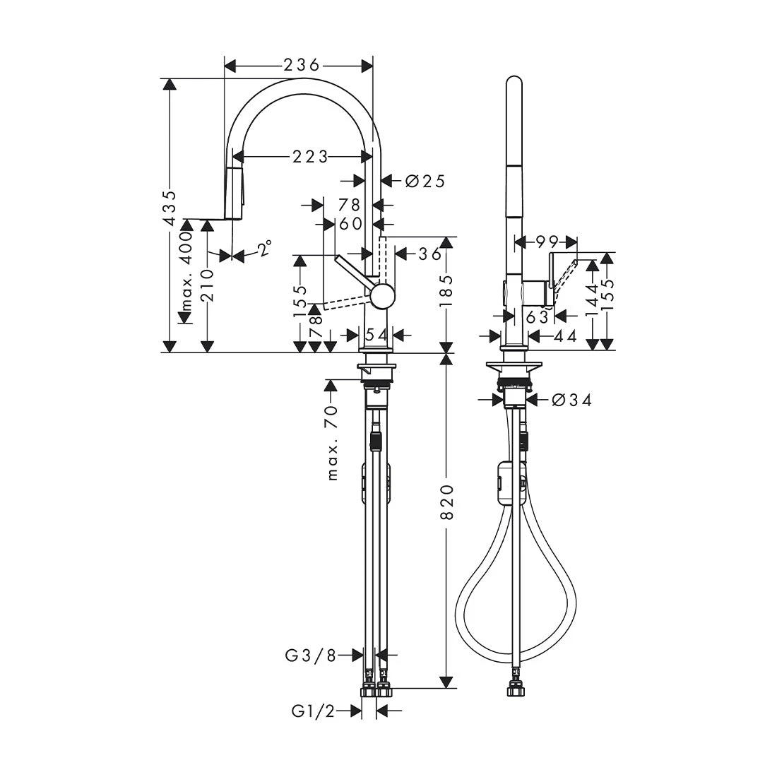 2-Jet Functionality: Offers laminar and shower spray options, with a lockable shower spray and automatic return for convenient operation.