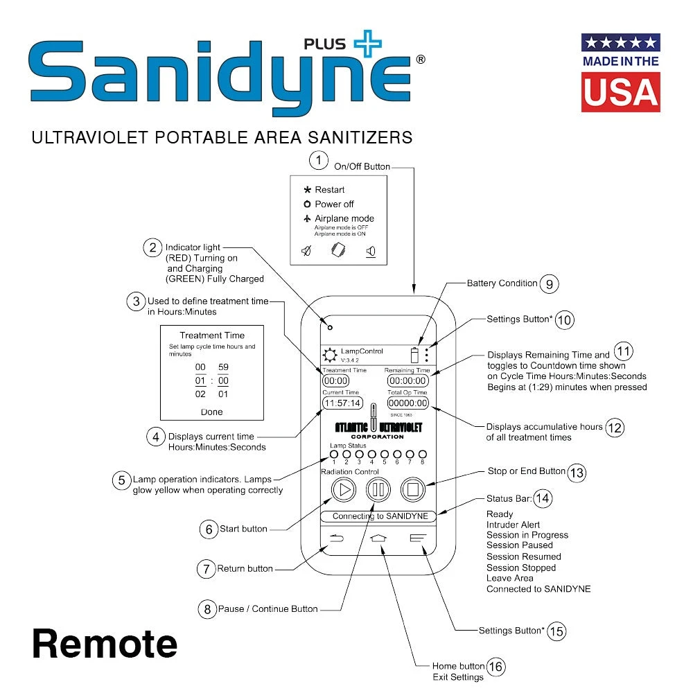 The Sanidyne® Plus has been carefully conceived to provide germicidal ultraviolet disinfection to purify the room air and exposed surfaces of an unoccupied area by the means of 8 STER-L-RAY ® High Output (HO) Germicidal Ultraviolet Lamps. These special lamps generate high levels of germicidal ultraviolet radiation lethal to infectious microorganisms such as bacteria, mold, and virus.