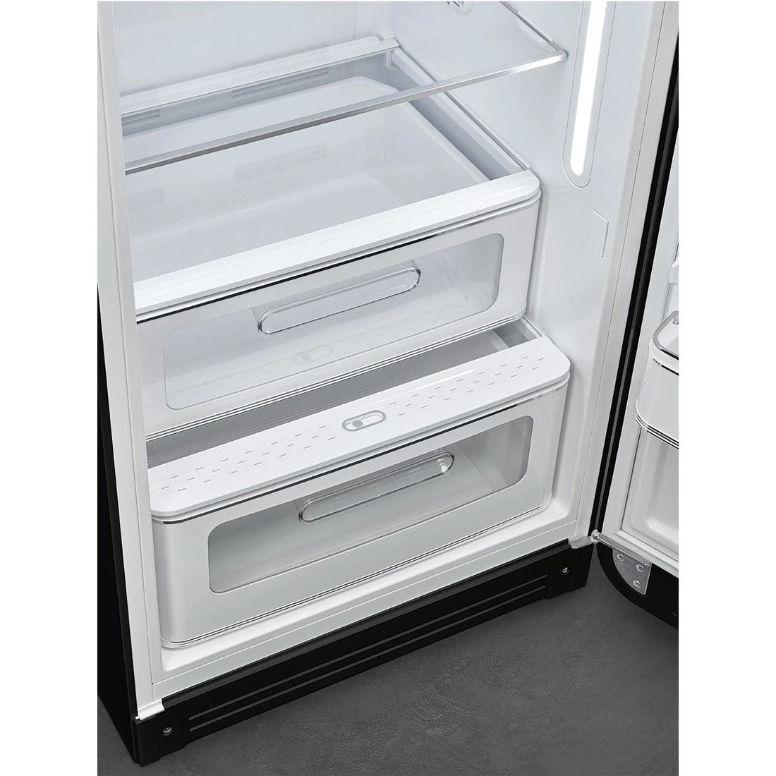 Classic curved lines, chrome accents, and a smooth black finish give this fridge its unmistakable retro character—designed to make a statement in any space.