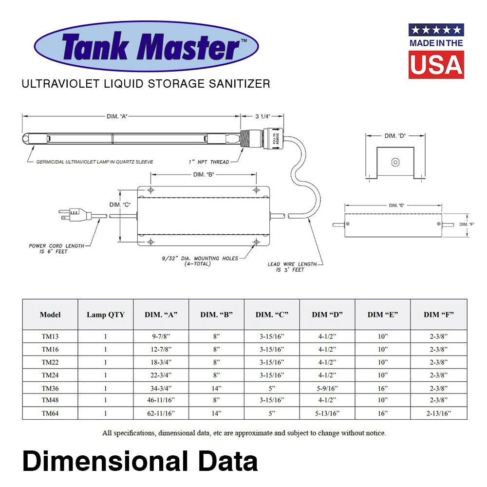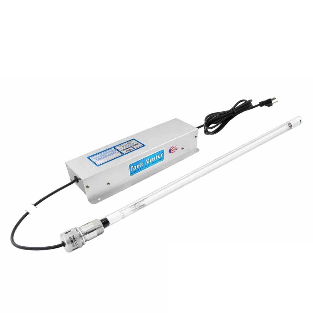 Tank Master™ Ultraviolet Liquid Storage Sanitizer provides in-place ultraviolet disinfection. This model will help maintain the quality of the air space and liquid contents of a storage tank. Many factors will affect the results of a Tank Master™ installation including: proper sizing (lamp size/quantity vs. tank size/capacity), ultraviolet transmission/absorbance of the liquid, proximity to the ultraviolet lamp, etc. Our UV Application Specialists can help size the equipment needed—call us!